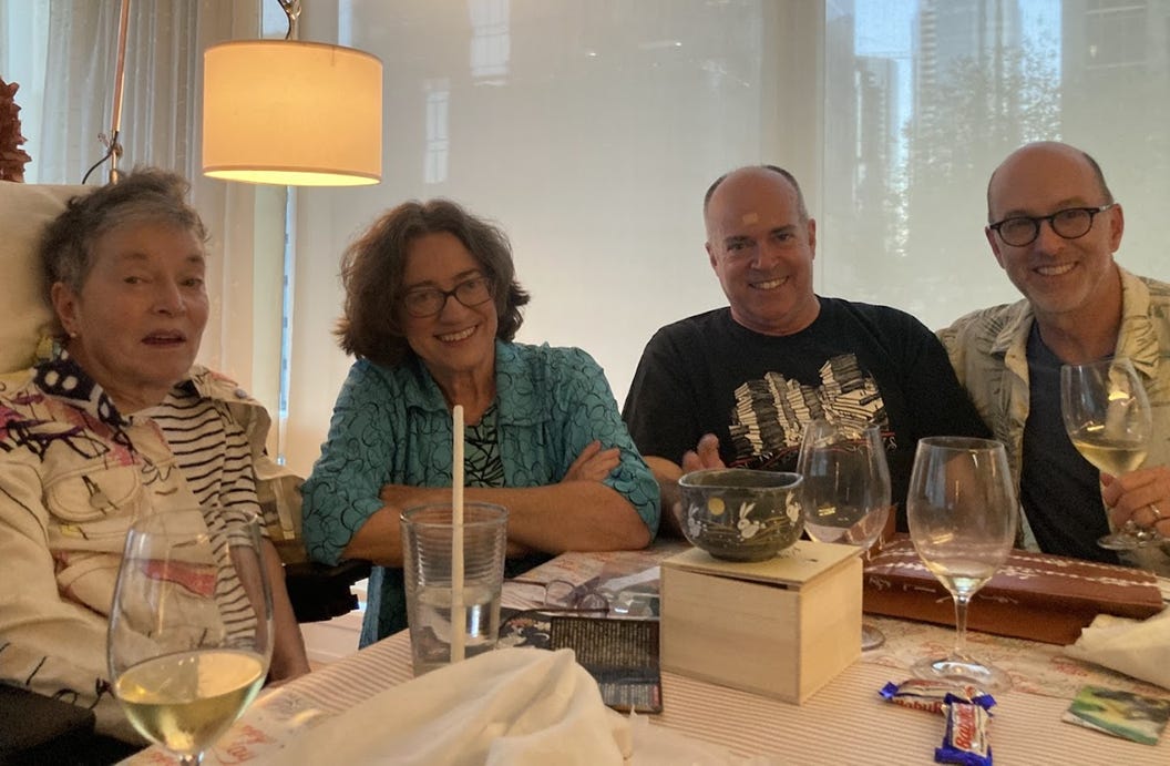 They arrived from Tokyo, Chicago, and the Oregon coast, siblings Caroline, John, and Bill, along with Aunt Liz, Cousin Christopher, and others. Catherine’s family name was Coney, a European rabbit. Take note of the rabbits on the tea bowl, center. And there are more rabbits on the table. I lined up all the rabbits and asked, “What do you get when the rabbits all shuffle backwards? You get a receding hare line. Haha.”